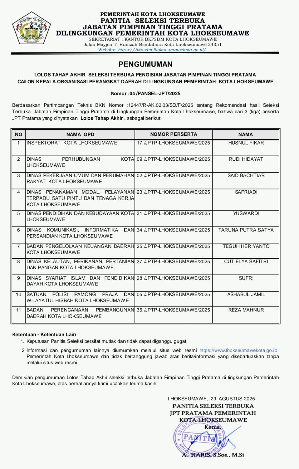 Durasi, Lhokseumawe – 11 Nama-nama yang lolos tahap akhir seleksi terbuka pengisian Jabatan Pimpinan Tinggi Pratama calon Kepala Organisasi Perangkat Daerah (OPD) di Lingkungan Pemko Lhokseumawe, sudah diumumkan oleh panitia seleksi, Jum’at Sore (29/8). Hal ini tertuang berdasarkan Pertimbangan Teknis (Pertek) Badan Kepegawaian Nasional (BKN) Nomor : 12447/R-AK.02.03/SD/F/2025 tentang rekomendasi hasil seleksi dari 3 peserta JPT Pratama yang lolos tahap akhir.