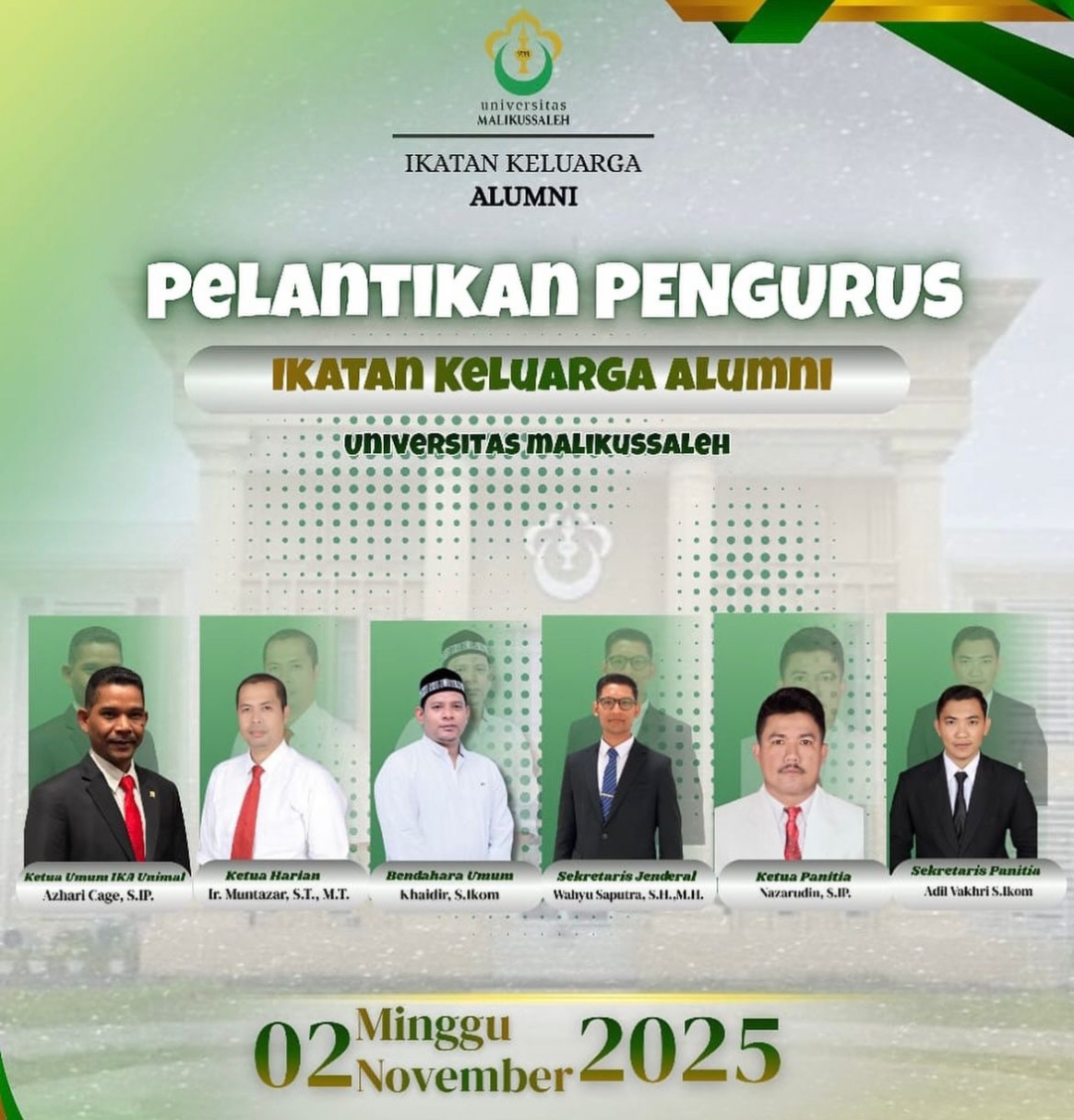 ACEH UTARA— Ikatan Keluarga Alumni Universitas Malikussaleh (IKA Unimal) akan menggelar acara pelantikan pengurus, di Kampus Unimal Reuleut, Kecamatan Muara Batu, Aceh Utara, Ahad 2 November 2025,