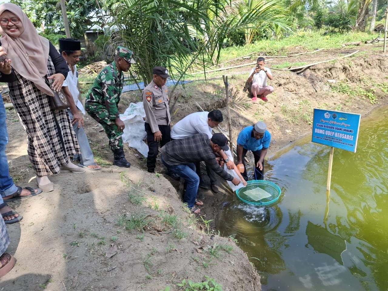 Camat Dewantara Munawir secara simbolis melepaskan benur di unit usaha ketahanan pangan pengembangan udang vaname.