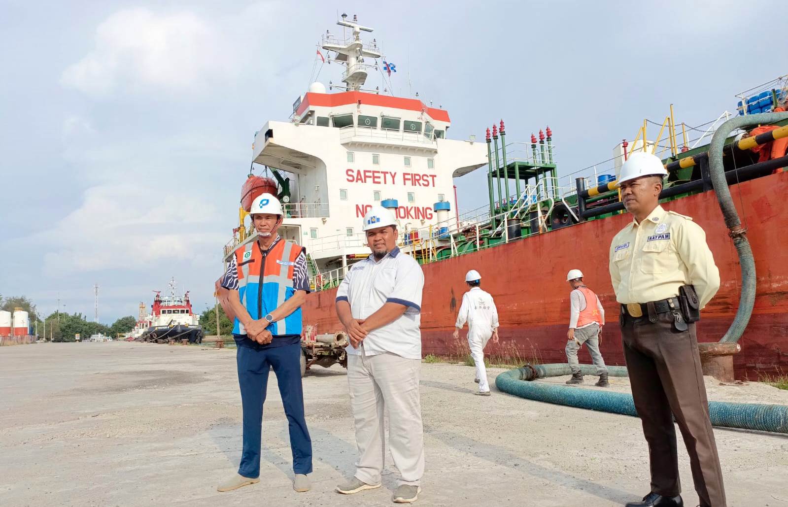 Manajemen PT. Aceh Makmur Bersama(AMB), Tarrmizi (tengah-red) bersama General Manager PT. Pelindo Multi Terminal Lhoksemawe Joni Hutama dan petugas keamanan Pelabuhan Umum Krueng Geukueh disela-sela monitoring kegiatan ekspor 6.500 Metrik Ton (MT) CPO dengan tujuan Kakinada Port, India, Jumat (20/6). Foto : (Durasi/Erwin)