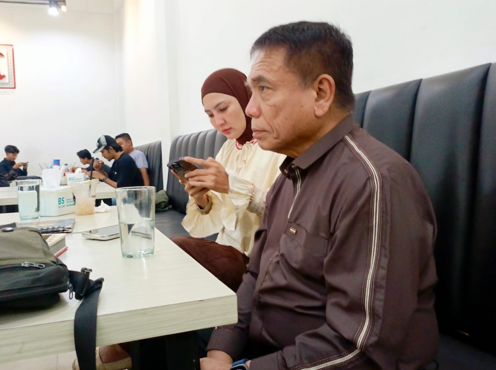 Eks Gubernur Aceh, Irwandi Yusuf bersama istrinya Steffy Burase di Bidjeh Koepi Premium, Jum’at Siang (4/7). Foto : (Durasi/Erwin)