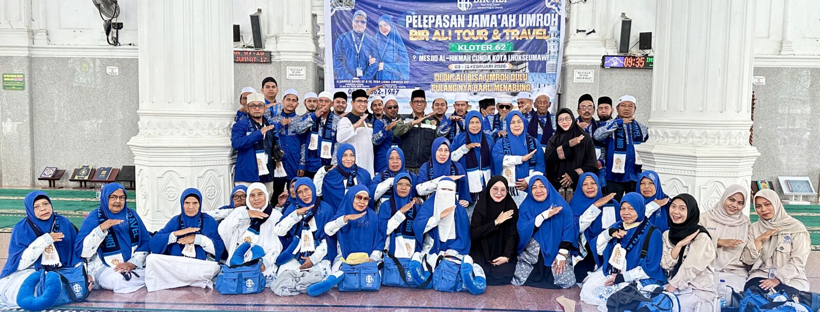 PT Bir Ali Tour and Travel kembali menegaskan konsistensinya dalam pelayanan ibadah umrah. Dalam satu bulan, perusahaan ini telah memberangkatkan tiga kloter jamaah umrah, termasuk Kloter 62 yang dilepas secara khidmat di Masjid Al-Hikmah Cunda, Kota Lhokseumawe, Selasa (3/2/2026).