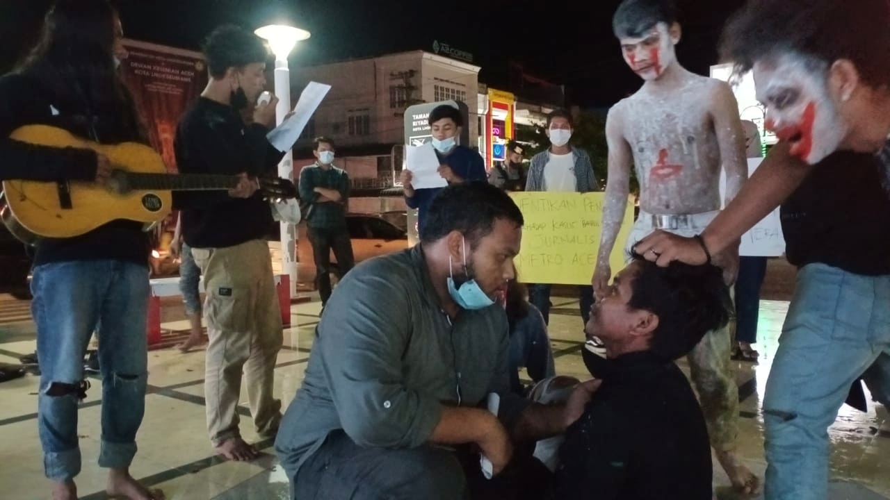Teatrikal “Indonesia Darurat Kebebasan Pers” yang ditampilkan sejumlah aktivis LMND Aceh menggambarkan tentang kekerasan, kriminalisasi, dan teror, yang menimpa para jurnalis di berbagai daerah.