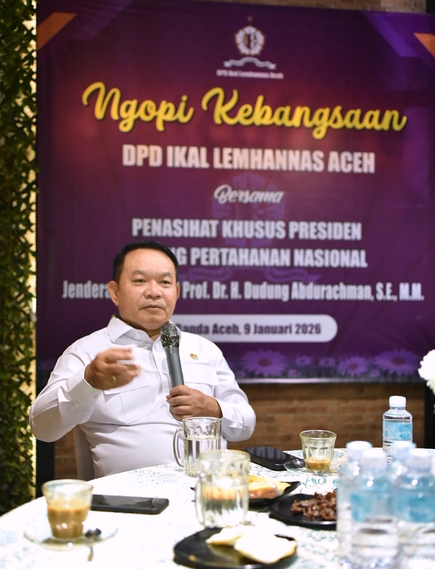 BANDA ACEH – Penasihat Khusus Presiden Bidang Pertahanan Nasional, Jenderal TNI (Purn) Prof. Dudung Abdurachman, menghadiri agenda “Ngopi Kebangsaan” bersama Ikatan Keluarga Alumni Lemhannas (IKAL) Aceh di Banda Aceh, Jumat (9/1/2026).