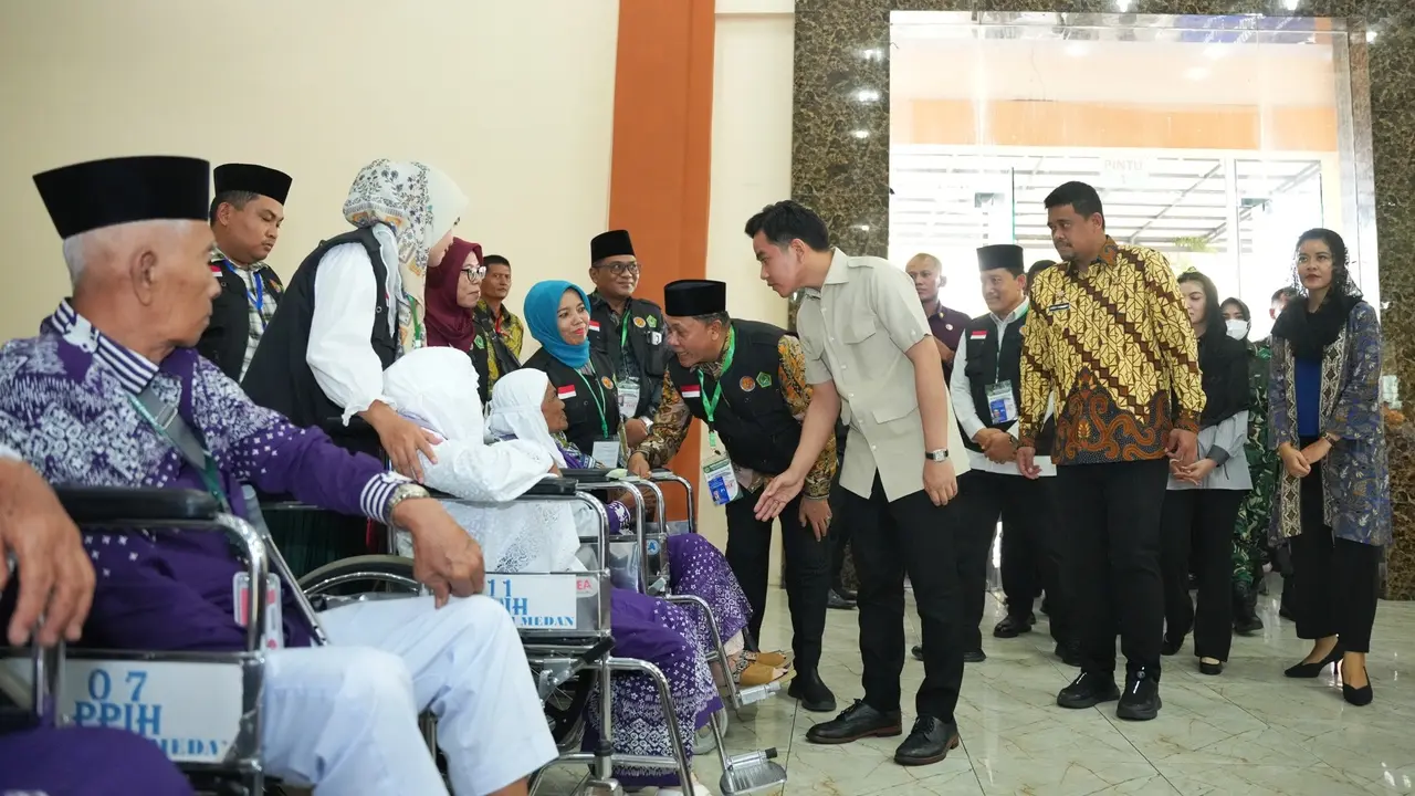 MEDAN – Wakil Presiden Republik Indonesia Gibran Rakabuming Raka bersama istrinya Selvi Ananda didampingi Gubernur Sumatera Utara Bobby Nasution dan Wali Kota Medan Rico Bayu Waas menyapa ratusan calon haji yang Embarkasi Medan yang akan menunaikan ibadah haji ke Tanah Suci.