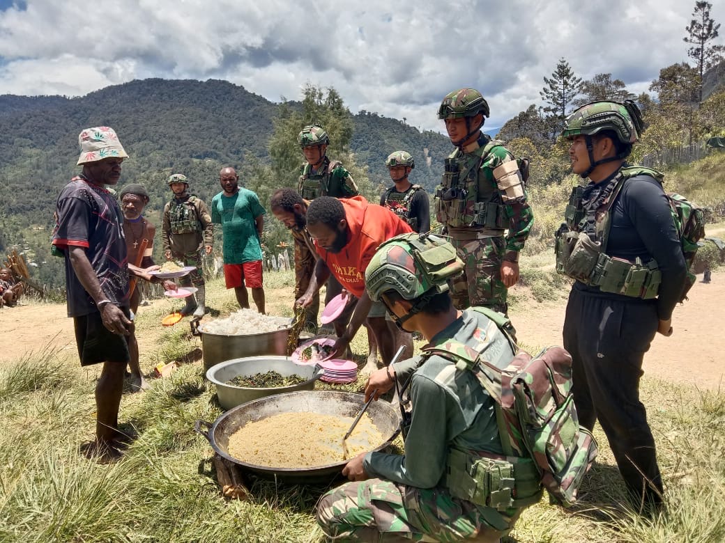 Makan bersama masyarakat sebagai sarana komunikasi bagi prajurit Satgas Yonif 113/JS di Kampung Bilai Distri Homeyo, Kabupaten Intan Jaya, Papua Tengah, Sabtu (4/10/2025).