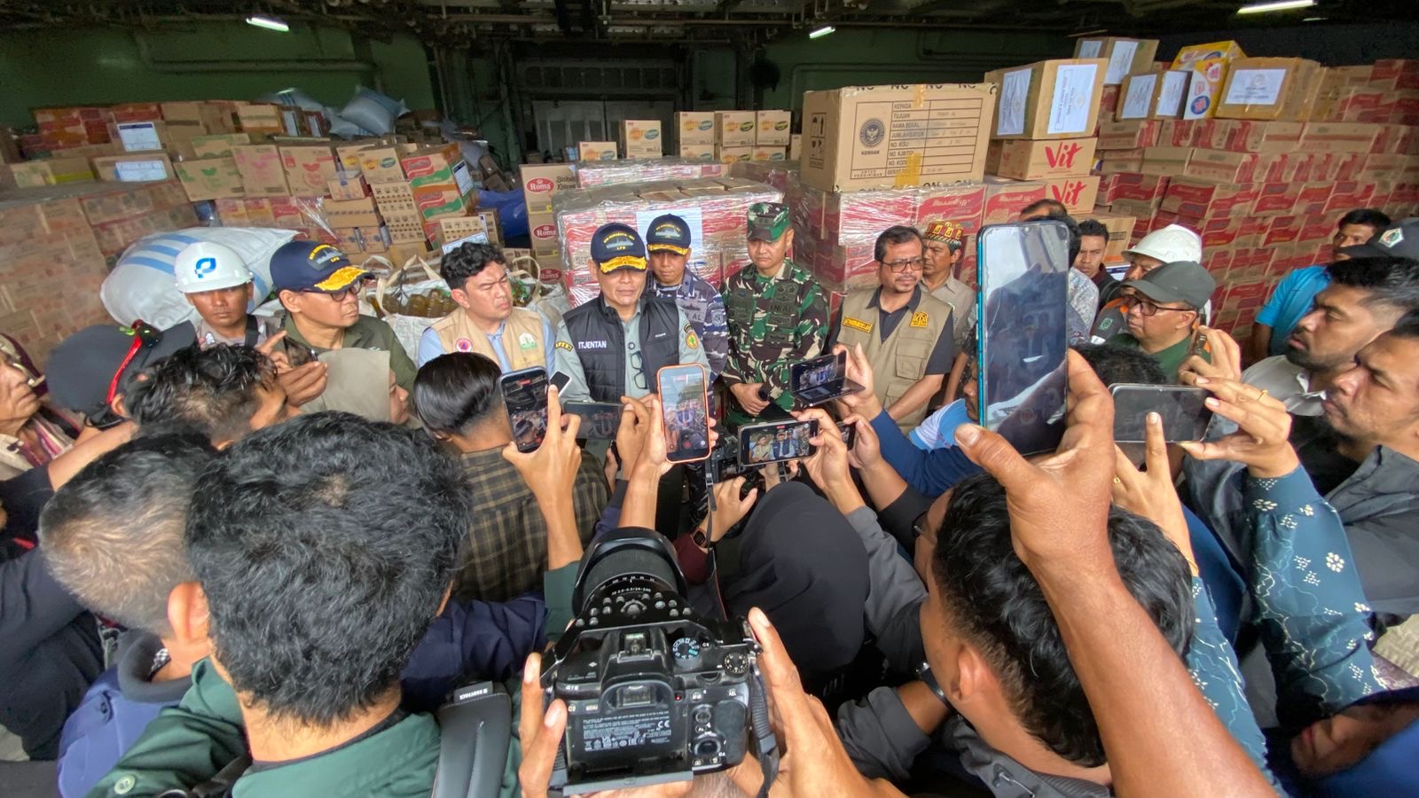 Inspektur Jenderal Kementerian Pertanian (Irjen Kementan) Letjen TNI (Purn) Irham Waroihan didampingi Komandan KRI Surabaya 591 Kolone Laut (P) Saifudin Zukhri, dan Staf Ahli Gubernur Aceh Almuniza, pada Kamis (18/12/2025), kembali menyalurkan bantuan kemanusiaan tahap kedua bagi masyarakat terdampak bencana banjir dan tanah longsor di Provinsi Aceh, saat bersandar di Pelabuhan Krueng Geukueh, Kecamatan Dewantara, Aceh Utara. durasi.co/Rahmat Mirza