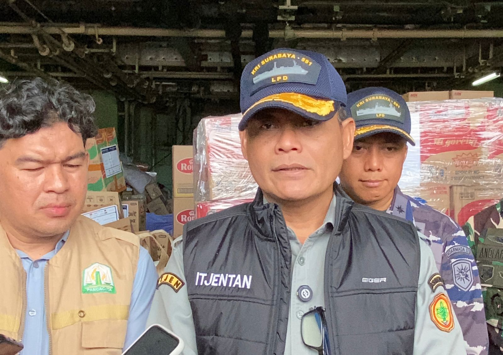 Inspektur Jenderal Kementerian Pertanian (Irjen Kementan) Letjen TNI (Purn) Irham Waroihan didampingi Komandan KRI Surabaya 591 Kolone Laut (P) Saifudin Zukhri, dan Staf Ahli Gubernur Aceh Almuniza, pada Kamis (18/12/2025), kembali menyalurkan bantuan kemanusiaan tahap kedua bagi masyarakat terdampak bencana banjir dan tanah longsor di Provinsi Aceh, saat bersandar di Pelabuhan Krueng Geukueh, Kecamatan Dewantara, Aceh Utara. durasi.co/Rahmat Mirza