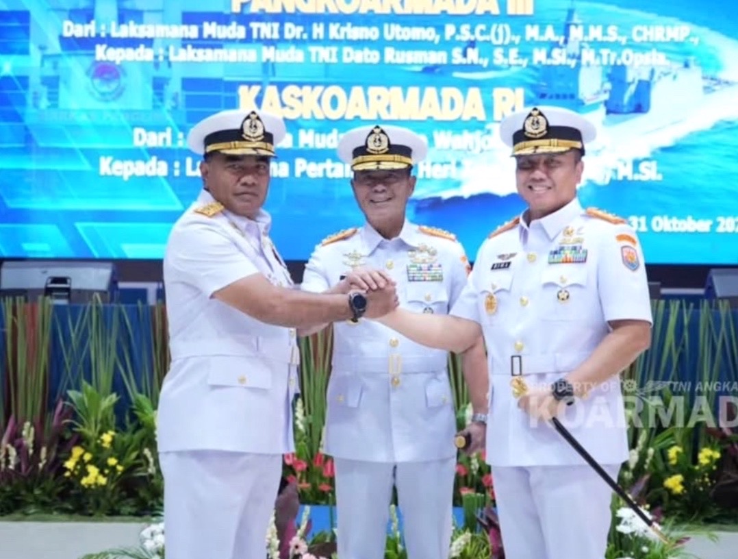 Panglima Komando Armada RI, Laksamana Madya TNI Dr. Denih Hendrata memimpin upacara sertijab Pangkoarmada I dari Laksda TNI Fauzi diserahterimakan kepada Laksda TNI Haris Bima Bayuseto di Gedung O.B. Syaaf, Mako Koarmada RI, Jakarta, Jumat (31/10/2025).
