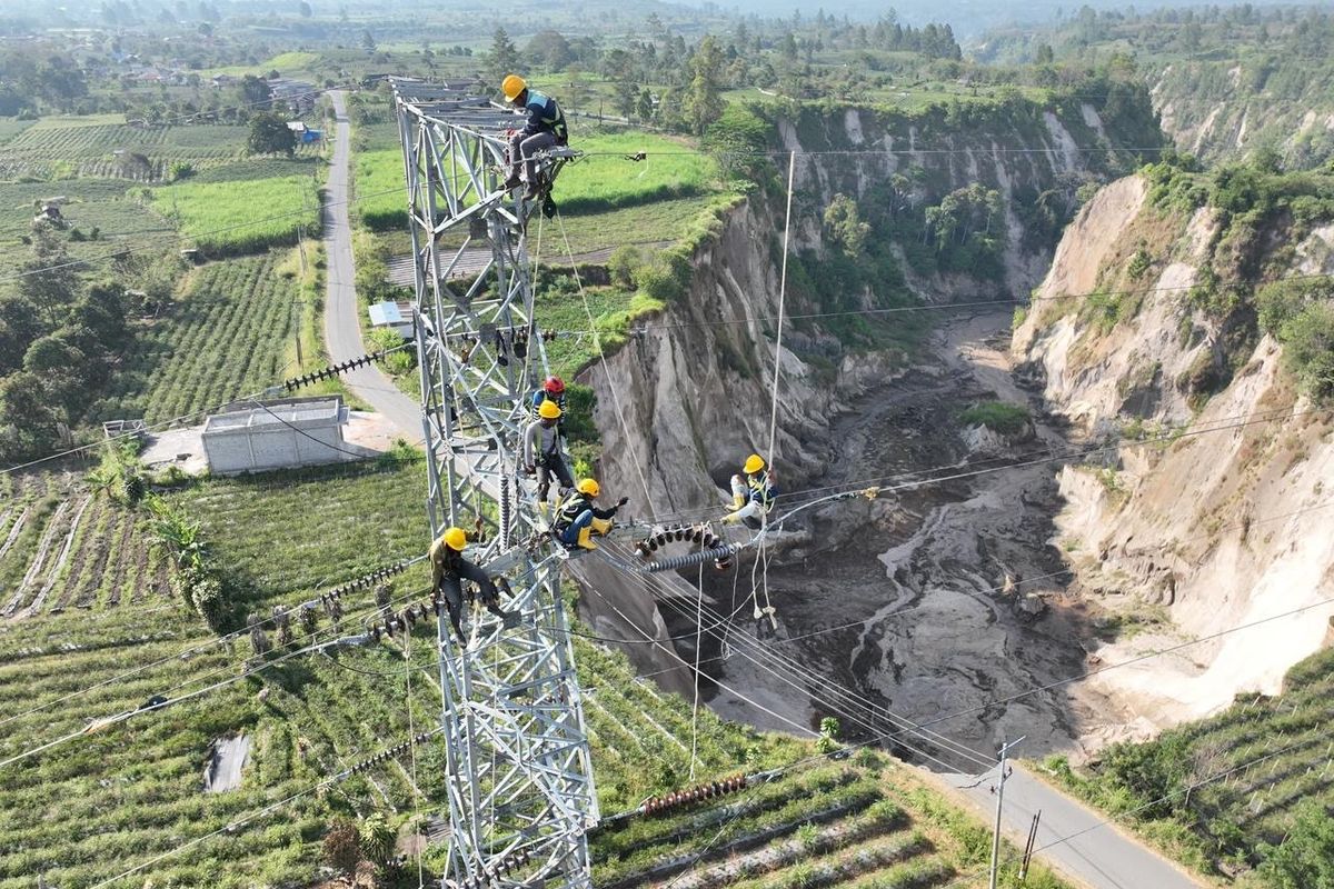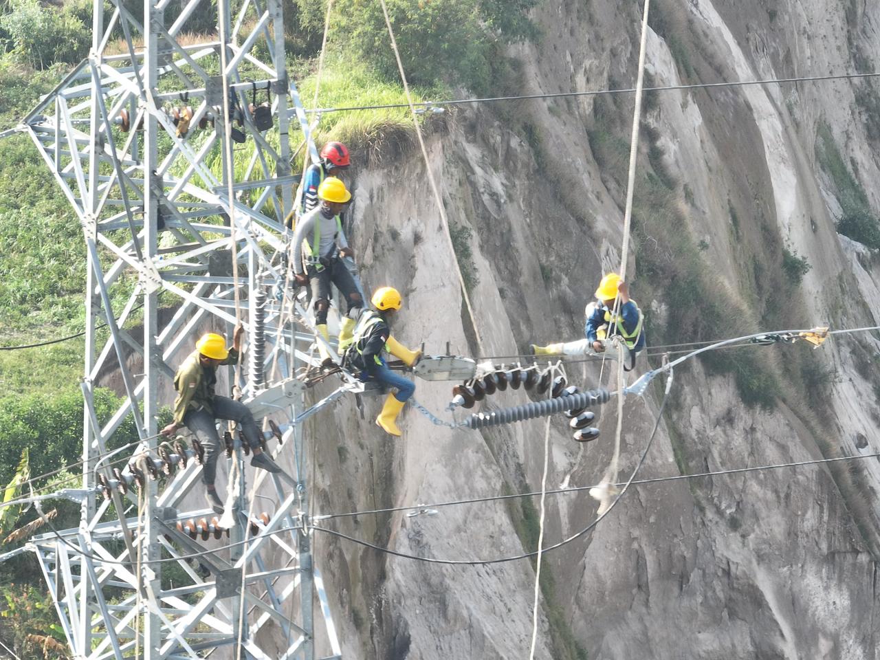 Khawatir ancam pasokan listrik. Puluhan petugas PLN bergerak cepat melakukan penyambungan kabel ke tower darurat.