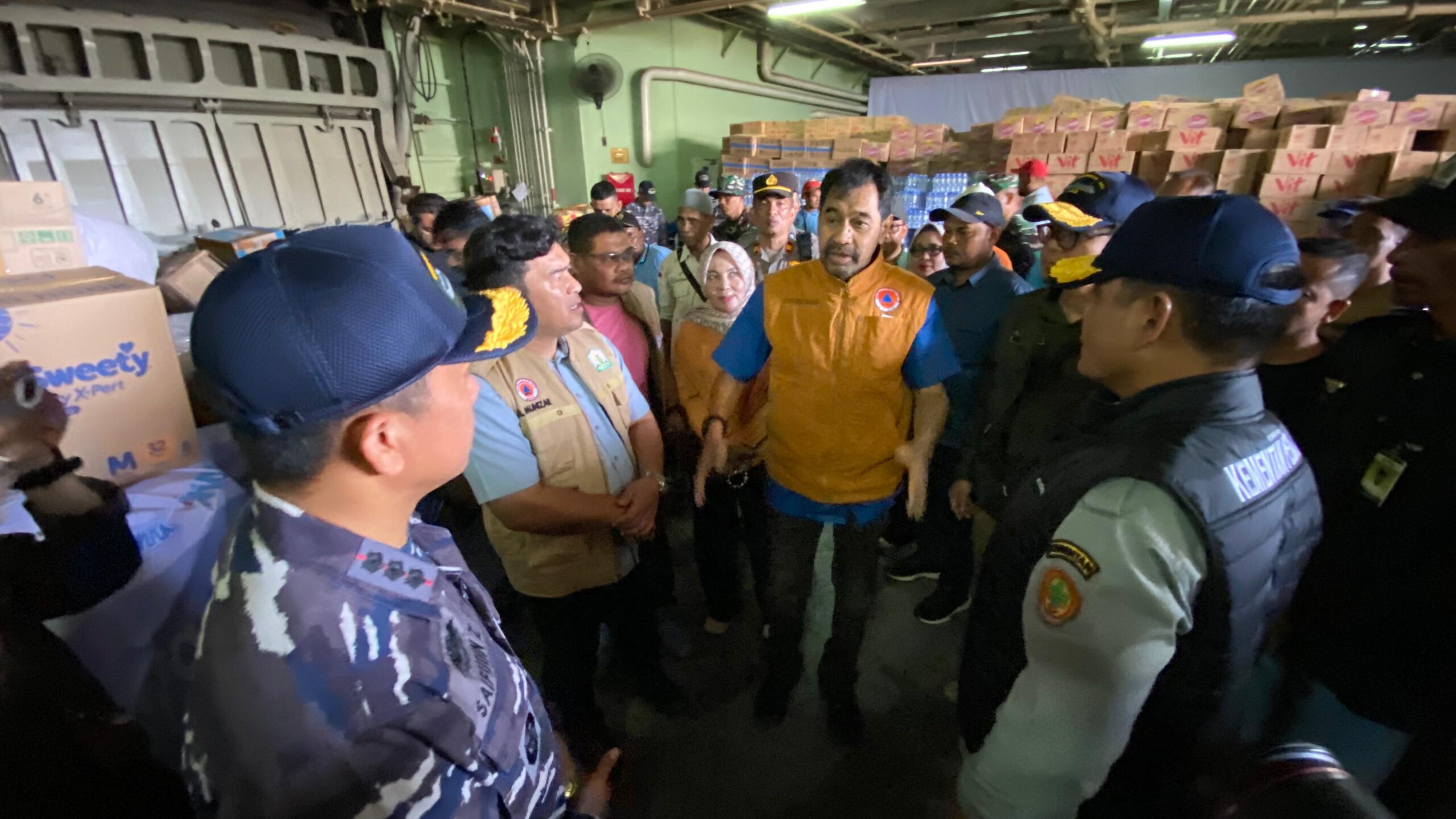 ACEH – Gubernur Aceh Muzakir Manaf akrab disapa Mualem didampingi Salmawati atau dikenal Bunda Salma meninjau langsung penyaluran bantuan kemanusiaan bagi masyarakat terdampak bencana banjir Aceh, pada Kamis (18/12/2025) melalui KRI Surabaya 591.