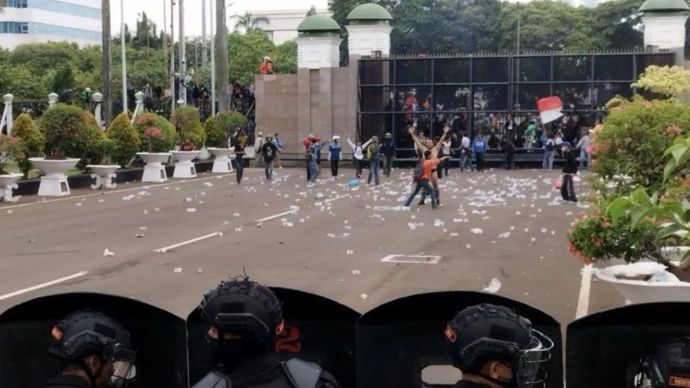 JAKARTA – Massa demo di depan Gedung DPR mencari-cari keberadaan anggota DPR yang berjoget pada saat Sidang Tahunan MPR 2025 kemarin.