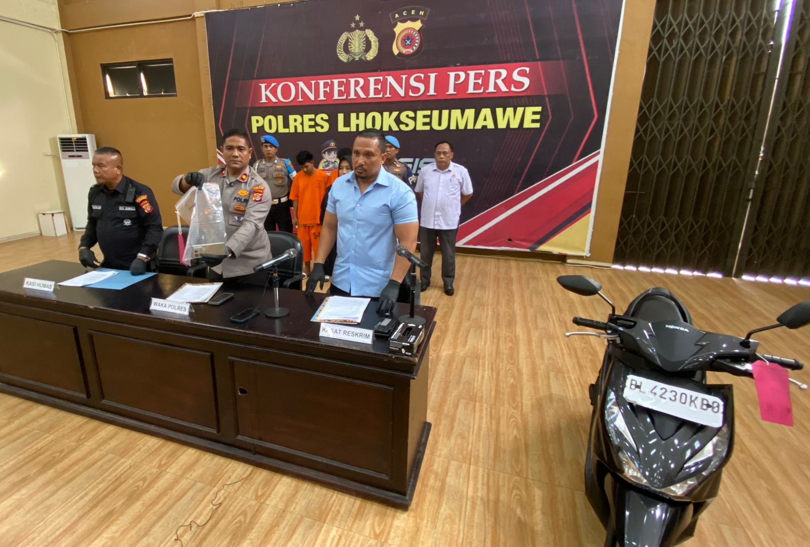 Kasus ini diungkap dalam konferensi pers yang dipimpin Wakapolres Lhokseumawe Kompol Salmidin, didampingi Kasat Reskrim IPTU Yudha Prasatya, serta dihadiri sejumlah awak media di Mapolres Lhokseumawe, Selasa (5/8/2025).