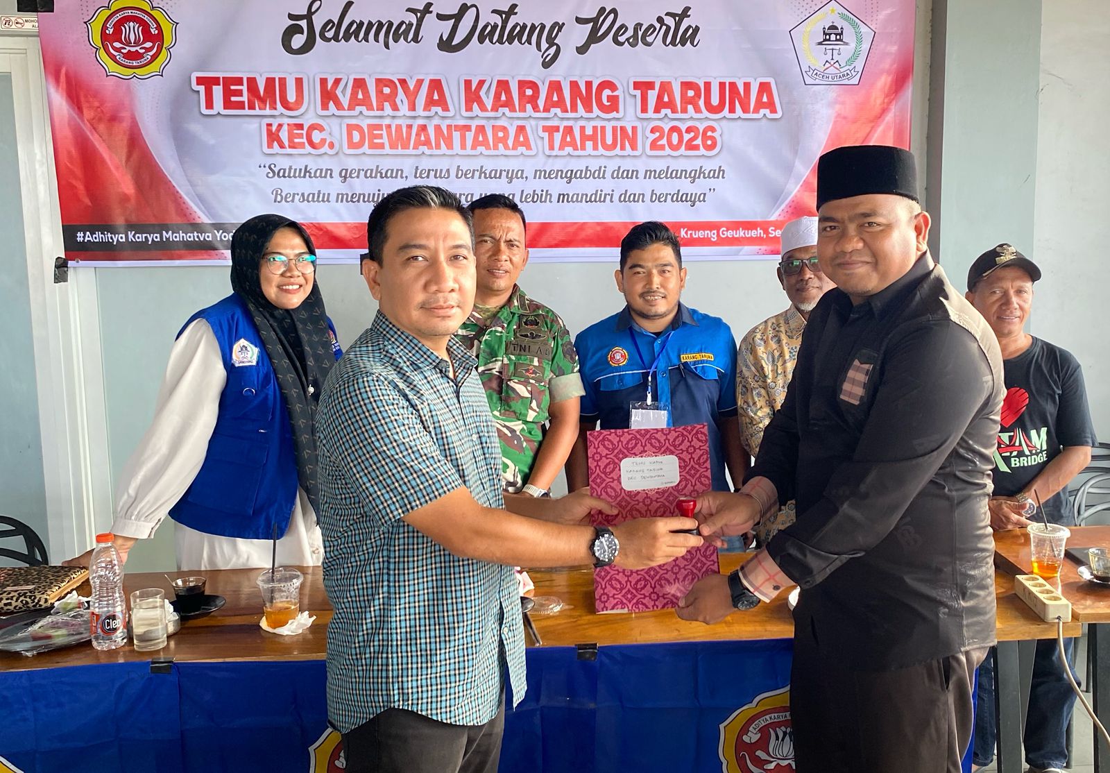 Camat Dewantara menyerahkan Surat Keputusan terpilihnya Ketua Karang Taruna periode 2026-2031 kepada Muhammad Iqbal pada acara Temu Karya Karang Taruna di Krueng Geukueh, Aceh Utara, Senin (16/2).