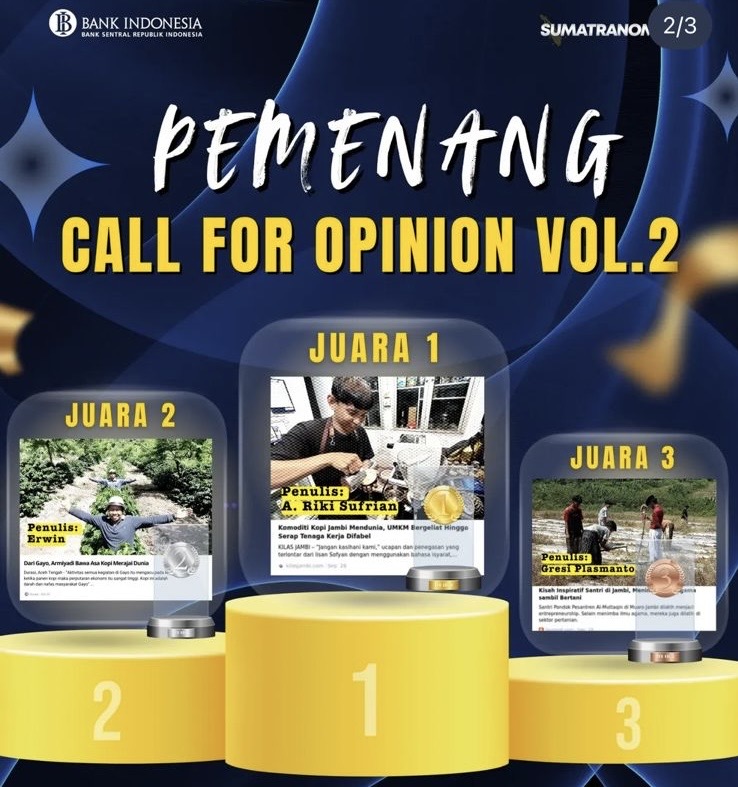 Sedangkan, untuk juara pertama dan ketiga diraih penulis berasal dari daerah yang sama Provinsi Jambi atas nama A. Rifki Sufrian dan Gresi Plasmanto. Penghargaaan ini diikuti oleh wartawan dan redaktur se-Sumatera yang ingin menyampaikan ide dan rekomendasinya terkait kebijakan isu strategis perekonimian di wilayah tersebut.