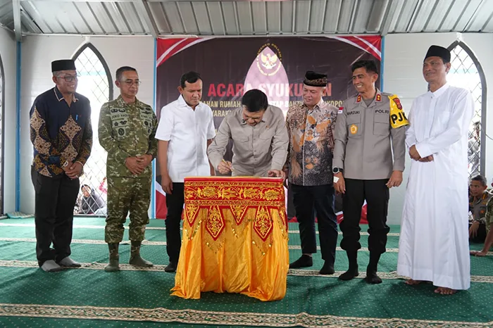 Menkopolkam RI Jenderal TNI (Purn) Djamari Chaniago menandatangani prasasti didampingi Bupati Aceh Utara Ismail A. Jalil (Ayah Wa) saat acara syukuran penyerahan Rumah Hunian Tetap (Huntap) di Masjid At-Taqwa, Gampong Kuala Cangkoi, Lapang, Sabtu (14/3/2026). Sebanyak 104 unit Huntap diserahkan kepada masyarakat terdampak banjir sebagai bagian dari upaya rehabilitasi dan rekonstruksi wilayah yang terintegrasi.