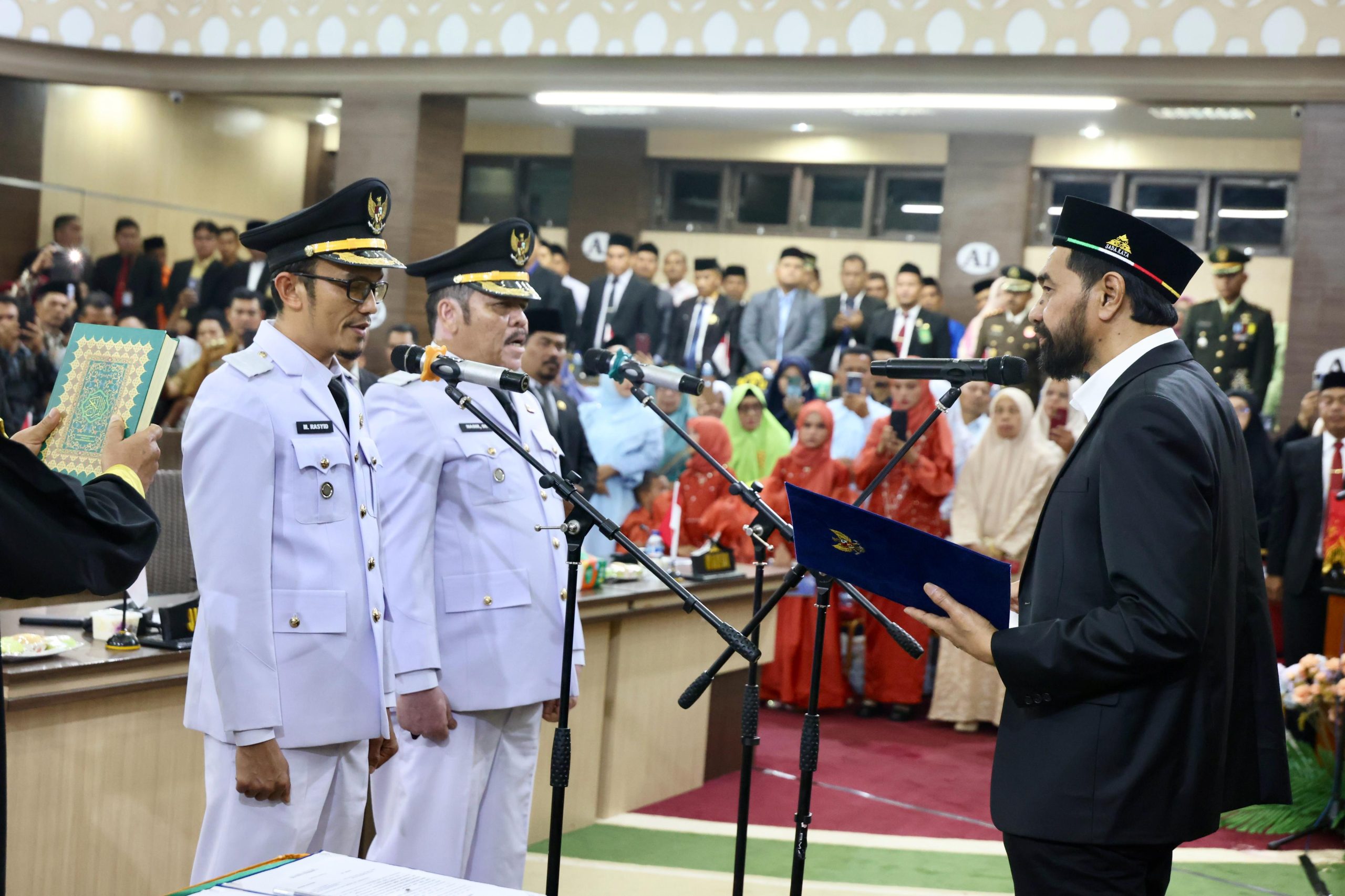 Gubernur Aceh Muzakir Manaf akrab disapa Mualem melantik Rasyid Bancin dan Nasir Kombih sebagai Wali Kota dan Wakil Wali Kota Subulussalam, di ruang Rapat Paripurna DPRK setempat, Sabtu (15/2/2025).