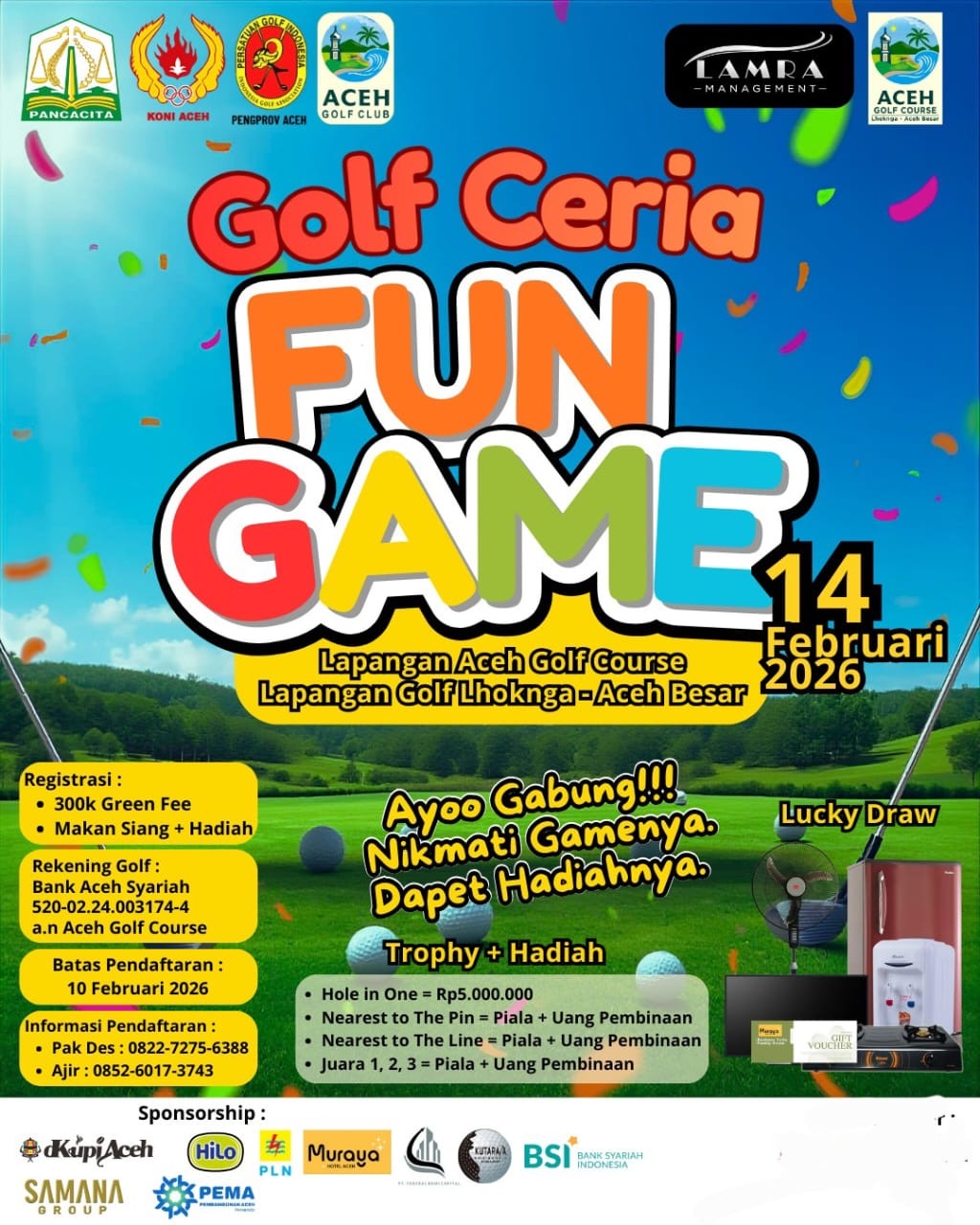 BANDA ACEH – Lamra Management bersama Aceh Golf Club akan menyelenggarakan kegiatan Golf Ceria Fun Game pada Sabtu, 14 Februari 2026, bertempat di Lapangan Aceh Golf Course, Lhoknga, Aceh Besar, Provinsi Aceh.
